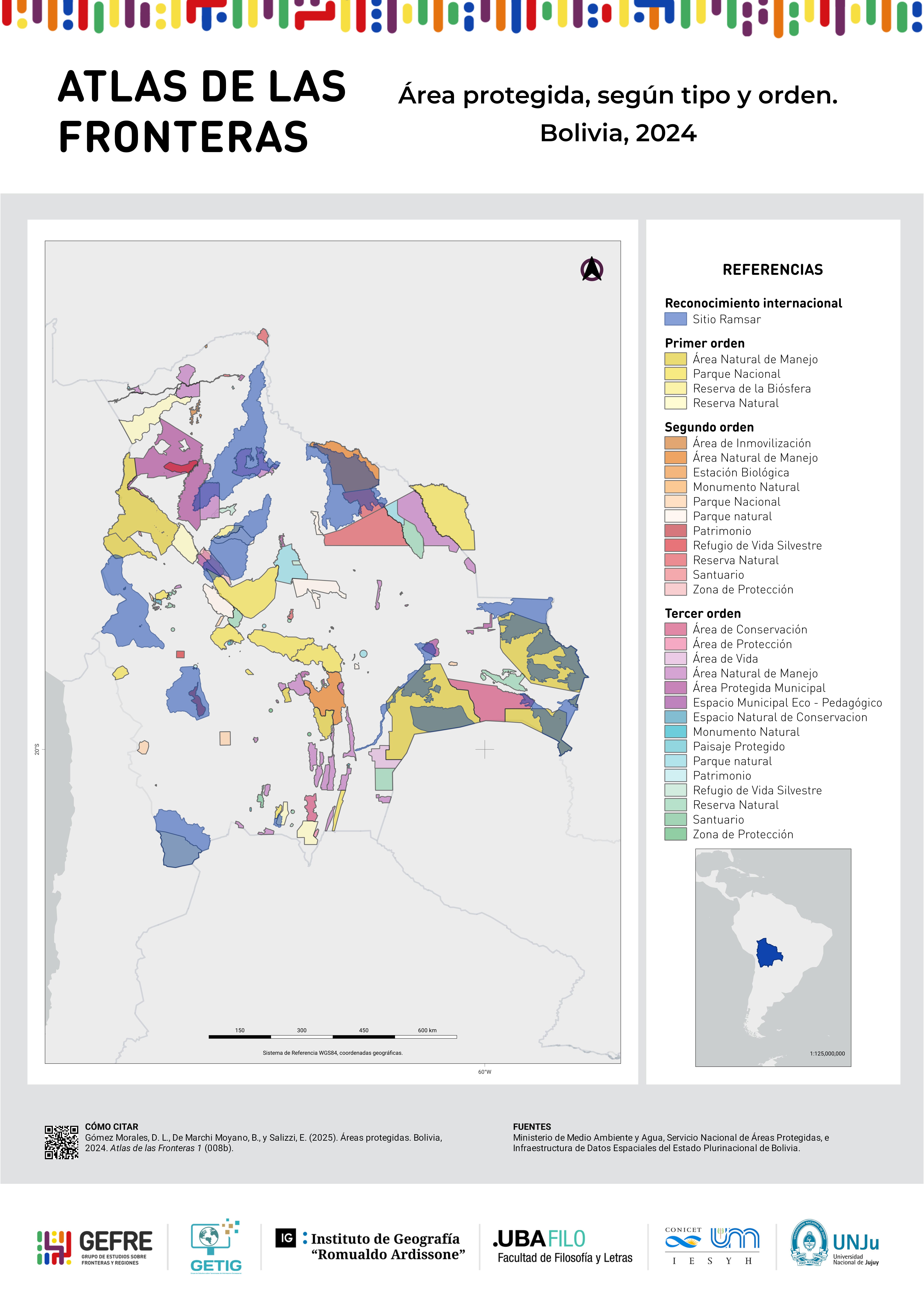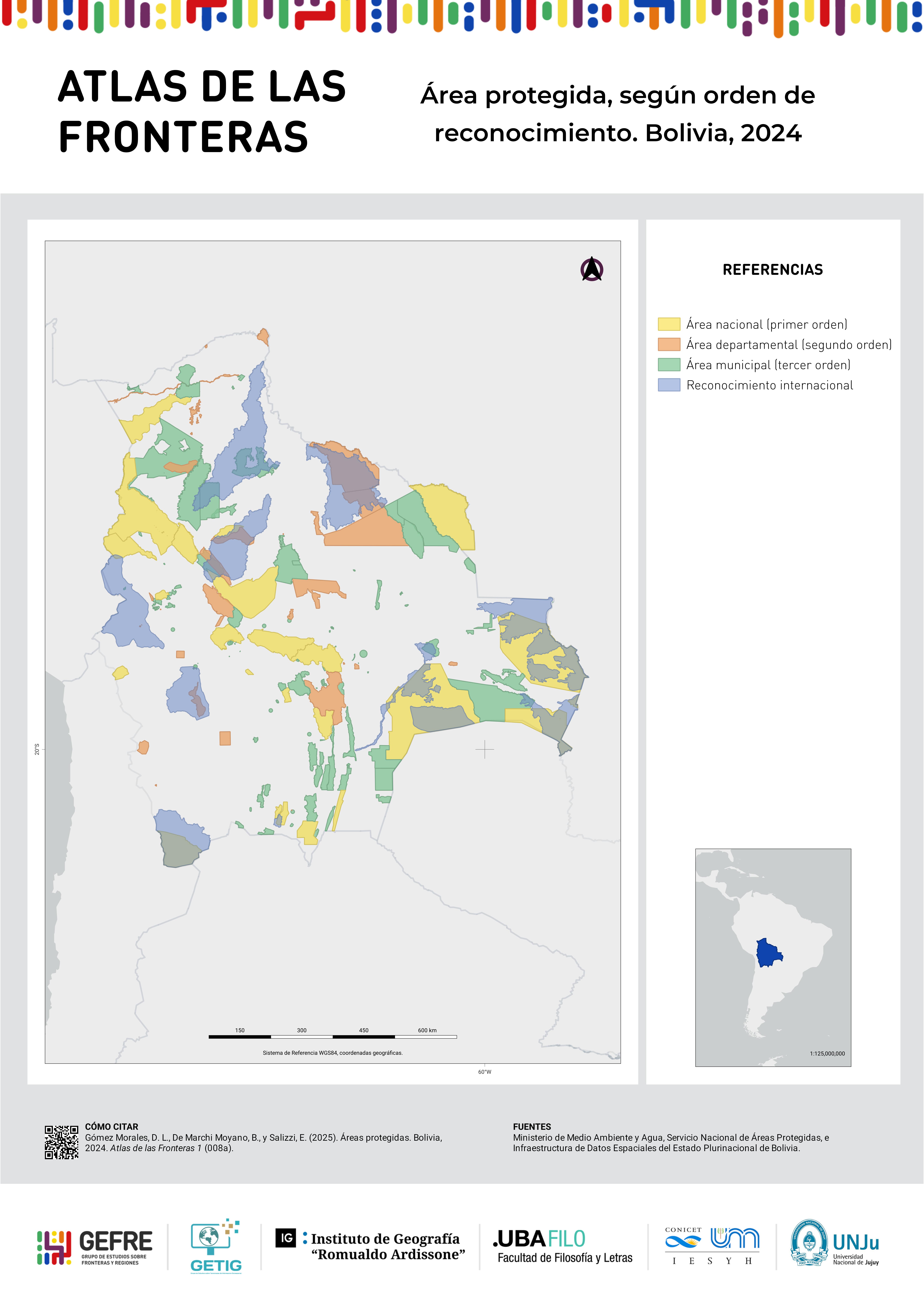 El presente mapa integra información sobre áreas protegidas en Bolivia, a escalas nacional, departamental, municipal y con reconocimiento internacional, basada en fuentes como el Sistema Nacional de Áreas Protegidas (SERNAP) y GeoBolivia, actualizadas hasta 2024, e incorpora sitios RAMSAR y reservas subnacionales. En su construcción, se priorizó la integración y validación de datos, normalización de formatos y corrección topológica para garantizar precisión. Los atributos se completaron mediante consulta cruzada en plataformas gubernamentales y documentos técnicos, aplicando criterios jerárquicos -priorizando las fuentes oficiales de cada país- para resolver discrepancias.
